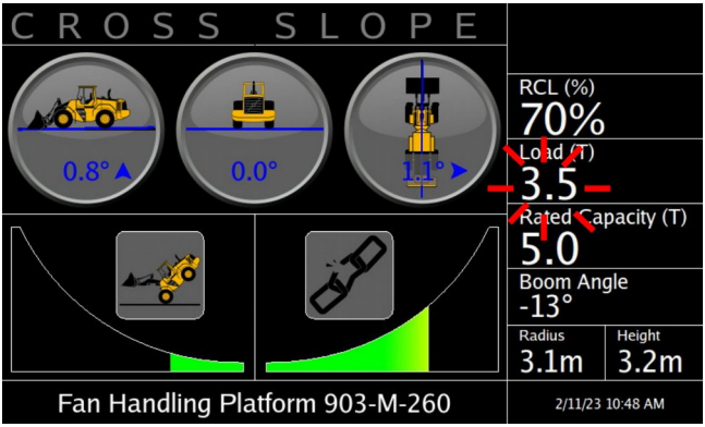 - LMI Percentage Graph – A visual representation of the longitudinal moment. The alarm will be triggered when the bars reach the red region, which interprets to the maximum safe angle has been reached. The bars are colour coded depending on their load percentage, with green between 0% - 79%, yellow between 80% - 99% and red 100%+.