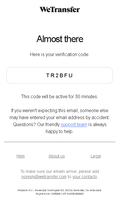 - WeTransfer will send a verification code to your email. Copy this verification code into the Enter verification code field and click Verify and Send